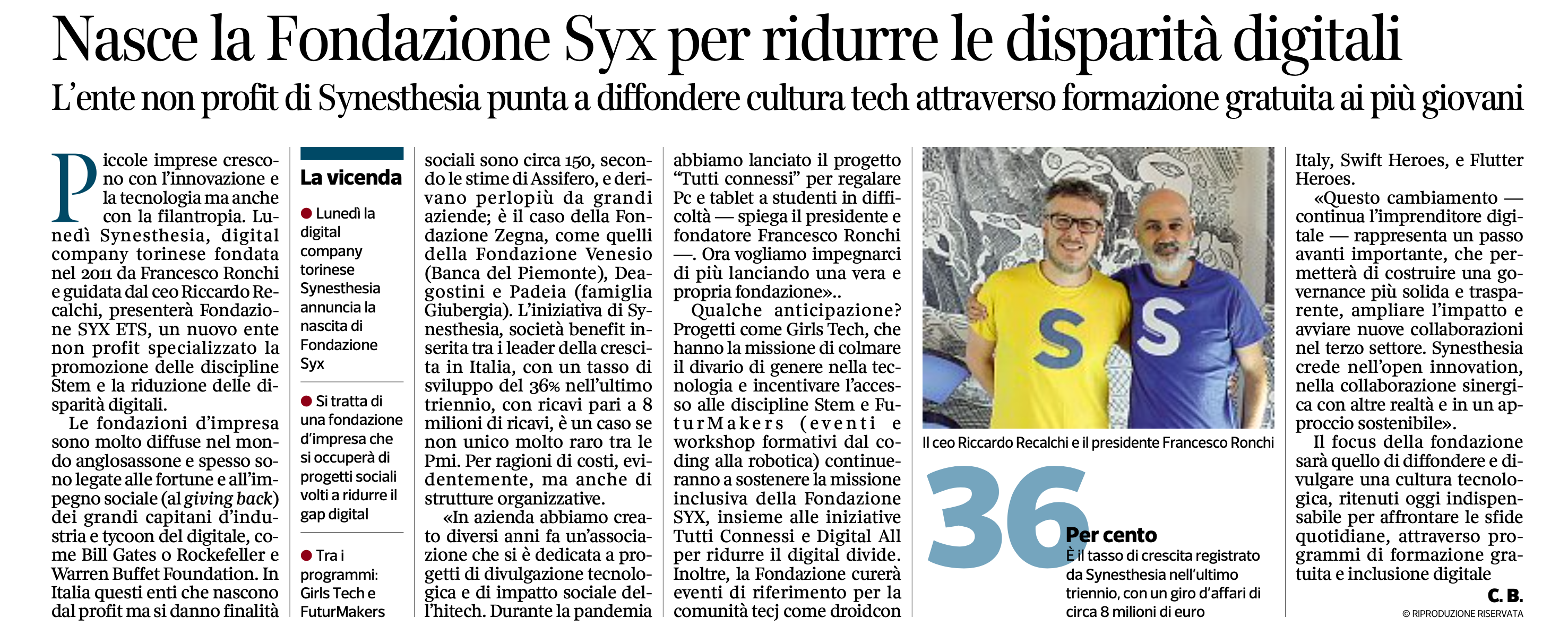 Piccole imprese crescono con l’innovazione e la tecnologia ma anche con la filantropia. Lunedì 25 novembre Synesthesia, digital company torinese fondata nel 2011 da Francesco Ronchi e guidata dal CEO Riccardo Recalchi, presenta Fondazione Syx Ets, un nuovo ente non profit specializzato la promozione delle discipline Stem e la riduzione delle disparità digitali.
